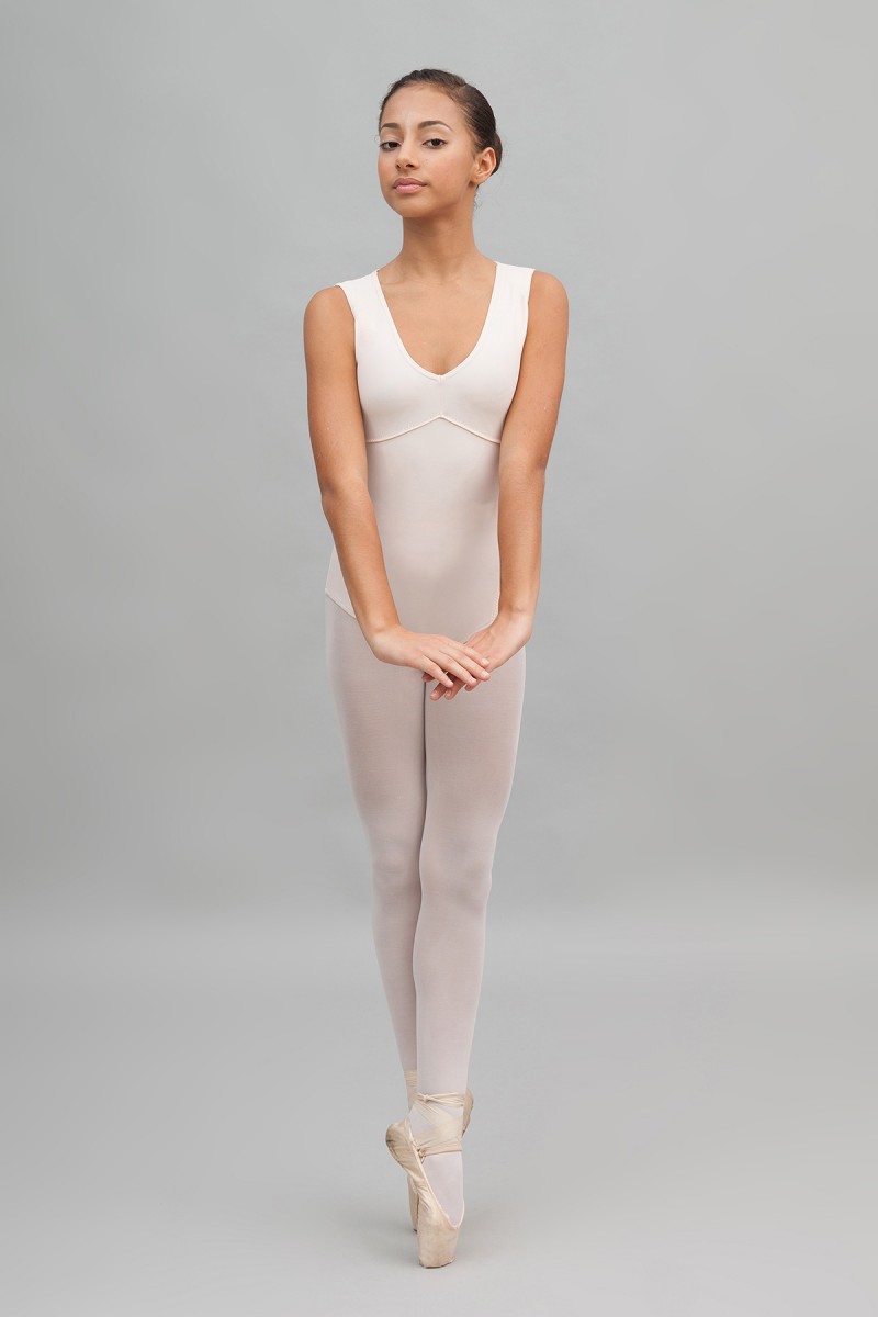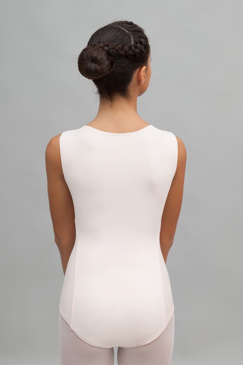Body smanicato in lycra 190 gg (80% poliammide 20% elastane), con scollo a V davanti, con fianchette davanti e dietro, taglio sotto seno e cuciture a zig zag, interamente foderato con tulle bielastico