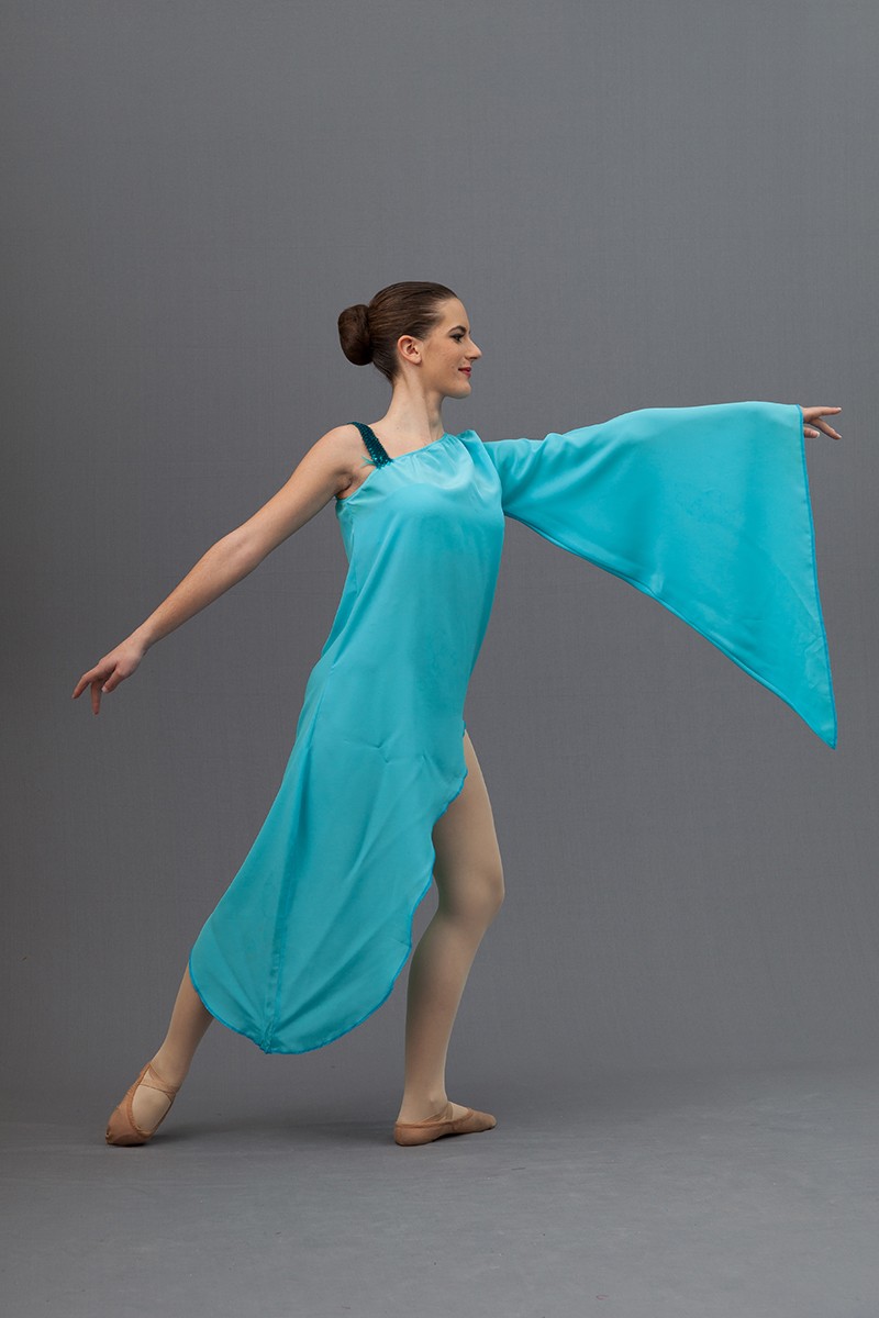 Abito danza in misto seta unico fondo, con manica ampia da un lato e bretella in paillettes elastica dall’altro, con un lato corto e l’altro lungo alla caviglia