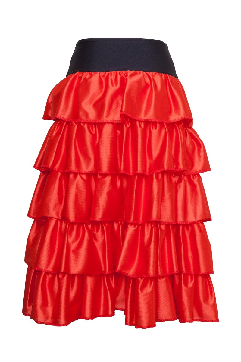 Gonna con base in rasetto (100% poliestere) con applicazione di 5 balze nello stesso tessuto. Apertura ampia sul centro davanti. Lunghezza al polpaccio. Baschina in vita e mutanda inserita in lycra nera 190 gg (80% poliammide 20% elastane).